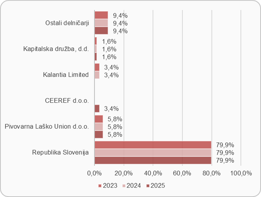 Lastniška struktura predstavlja pomemben element korporativnega upravljanja, saj vpliva na stabilnost poslovanja, preglednost odločanja in dolgoročno usmerjenost družbe. Konec leta 2025 je bilo v delniški knjigi za družbo Elektro Maribor d. d. evidentiranih 544 delničarjev, kar je za 7 delničarjev oziroma 1,3 % manj glede na leto 2024. Republika Slovenija ostaja naš največji delničar.