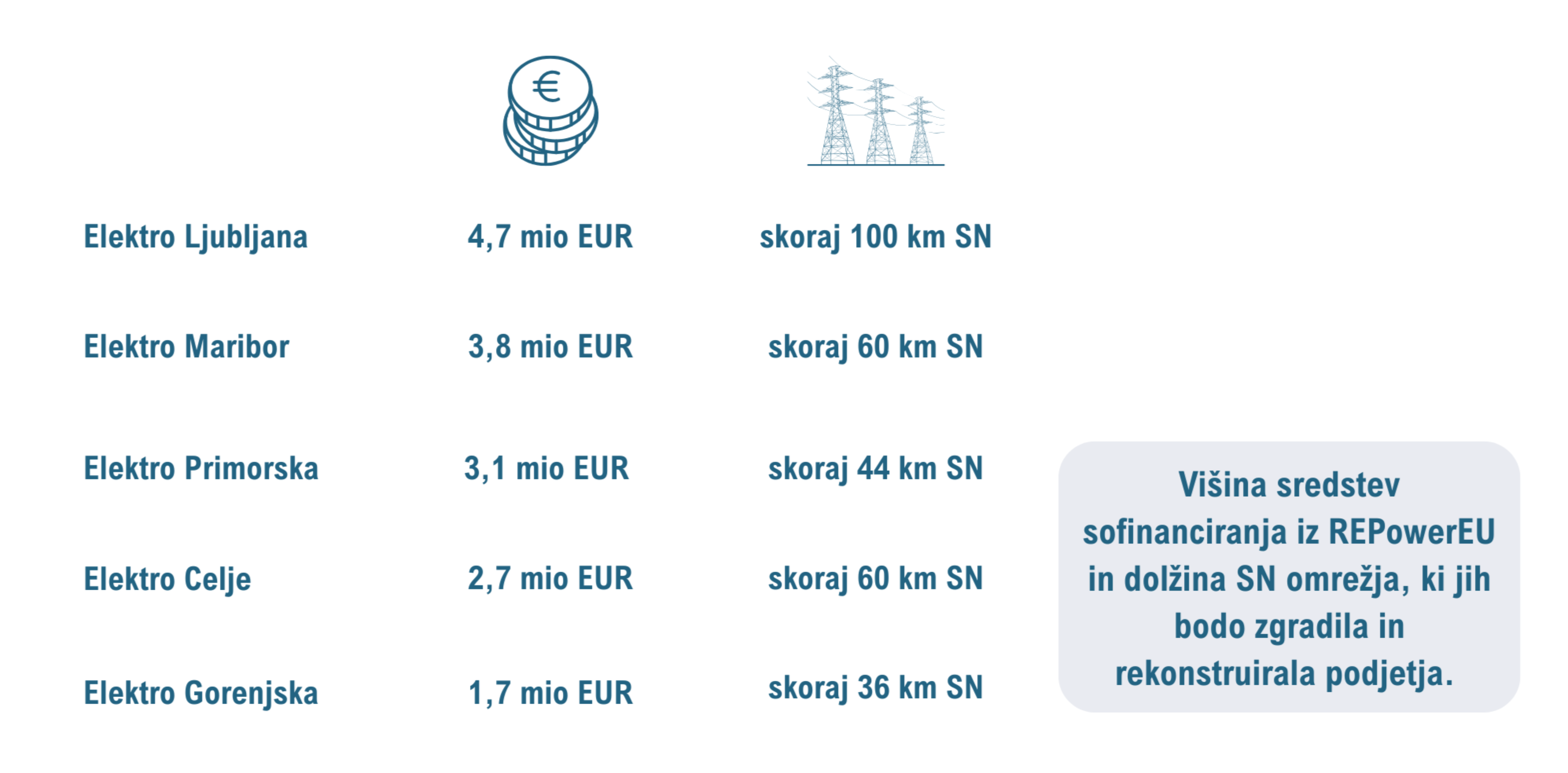 Elektrodistribucijska podjetja Elektro Ljubljana, Elektro Maribor, Elektro Celje, Elektro Primorska in Elektro Gorenjska smo tako uspešno pridobila sredstva tudi na razpisu Ministrstva za okolje, podnebje in energijo (MOPE) v okviru Načrta za okrevanje in odpornost, razvojnega področja REPowerEU, in sicer za krepitev distribucijskega srednjenapetostnega omrežja električne energije, v okviru katerega je bilo predvideno sofinanciranje najmanj 279 km novega ali rekonstruiranega obstoječega SNO na območju Republike Slovenije. Višina sredstev, ki so na razpolago za sofinanciranje projektov pa znaša 19.895.000,00 EUR.
